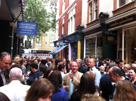 On Tuesday 3 July 2012, about sixty authors, agents and faithful fans were invited to arrive at 6.30. In theory it was to be wine and canapés on a balmy summer evening. In reality it was grey and drizzling. But crime writers are not easily discouraged, nor are their fans!